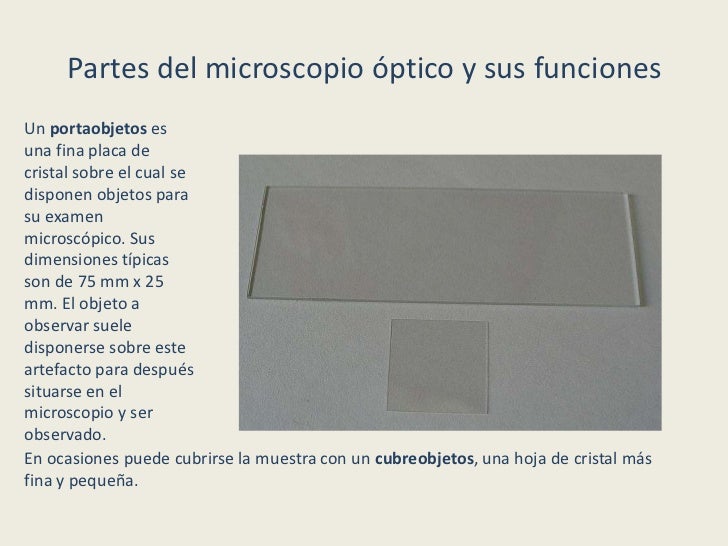 - 9. Partes del microscopio óptico y sus funcionesUn portaobjetos esuna fina placa decristal sobre el cual sedisponen objetos parasu examenmicroscópico. Susdimensiones típicasson de 75 mm x 25mm. El objeto aobservar sueledisponerse sobre esteartefacto para despuéssituarse en elmicroscopio y serobservado.En ocasiones puede cubrirse la muestra con un cubreobjetos, una hoja de cristal másfina y pequeña.