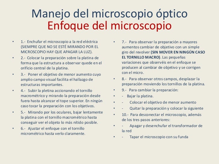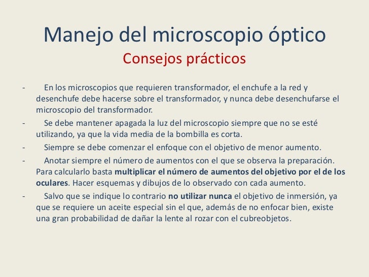 - 10. Manejo del microscopio óptico Consejos prácticos- En los microscopios que requieren transformador, el enchufe a la red y desenchufe debe hacerse sobre el transformador, y nunca debe desenchufarse el microscopio del transformador.- Se debe mantener apagada la luz del microscopio siempre que no se esté utilizando, ya que la vida media de la bombilla es corta.- Siempre se debe comenzar el enfoque con el objetivo de menor aumento.- Anotar siempre el número de aumentos con el que se observa la preparación. Para calcularlo basta multiplicar el número de aumentos del objetivo por el de los oculares. Hacer esquemas y dibujos de lo observado con cada aumento.- Salvo que se indique lo contrario no utilizar nunca el objetivo de inmersión, ya que se requiere un aceite especial sin el que, además de no enfocar bien, existe una gran probabilidad de dañar la lente al rozar con el cubreobjetos.