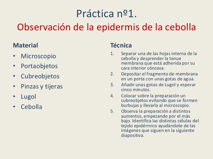 - 13. Práctica nº1. Observación de la epidermis de la cebollaMaterial Técnica 1. Separar una de las hojas interna de la• Microscopio cebolla y desprender la tenue membrana que está adherida por su• Portaobjetos cara interior cóncava. 2. Depositar el fragmento de membrana• Cubreobjetos en un porta con unas gotas de agua.• Pinzas y tijeras 3. Añadir unas gotas de Lugol y esperar cinco minutos.• Lugol 4. Colocar sobre la preparación un cubreobjetos evitando que se formen• Cebolla burbujas y llevarla al microscopio. 5. Observa la preparación a distintos aumentos, empezando por el más bajo. Identifica las distintas células del tejido epidérmico ayudándote de las imágenes que siguen en la siguiente diapositiva.