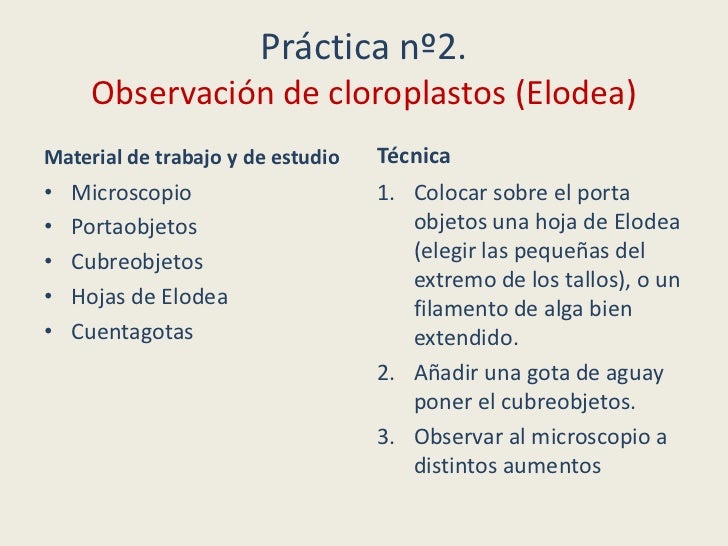- 15. Práctica nº2. Observación de cloroplastos (Elodea)Material de trabajo y de estudio Técnica• Microscopio 1. Colocar sobre el porta• Portaobjetos objetos una hoja de Elodea• Cubreobjetos (elegir las pequeñas del extremo de los tallos), o un• Hojas de Elodea filamento de alga bien• Cuentagotas extendido. 2. Añadir una gota de aguay poner el cubreobjetos. 3. Observar al microscopio a distintos aumentos