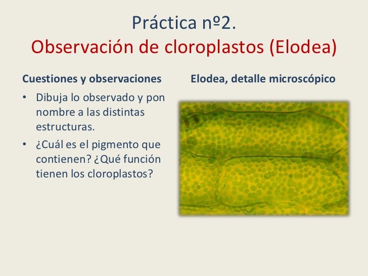 - 16. Práctica nº2. Observación de cloroplastos (Elodea)Cuestiones y observaciones Elodea, detalle microscópico• Dibuja lo observado y pon nombre a las distintas estructuras.• ¿Cuál es el pigmento que contienen? ¿Qué función tienen los cloroplastos?