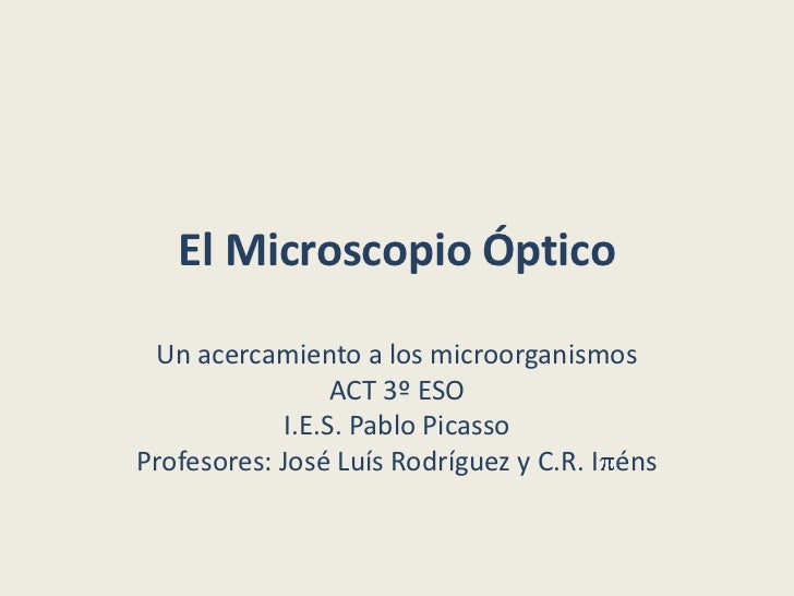 - 1. El Microscopio Óptico Un acercamiento a los microorganismos ACT 3º ESO I.E.S. Pablo PicassoProfesores: José Luís Rodríguez y C.R. I éns