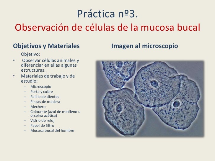 - 18. Práctica nº3. Observación de células de la mucosa bucalObjetivos y Materiales Imagen al microscopio Objetivo:• Observar células animales y diferenciar en ellas algunas estructuras.• Materiales de trabajo y de estudio: – Microscopio – Porta y cubre – Palillo de dientes – Pinzas de madera – Mechero – Colorante (azul de metileno u orceína acética) – Vidrio de reloj – Papel de filtro – Mucosa bucal del hombre