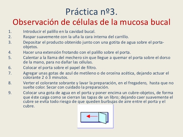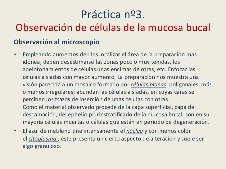 - 19. Práctica nº3. Observación de células de la mucosa bucal1. Introducir el palillo en la cavidad bucal.2. Raspar suavemente con la uña la cara interna del carrillo.3. Depositar el producto obtenido junto con una gotita de agua sobre el porta- objetos.4. Hacer una extensión frotando con el palillo sobre el porta.5. Calentar a la llama del mechero sin que llegue a quemar el porta sobre el dorso de la mano, para no dañar las células.6. Colocar el porta sobre el papel de filtro.7. Agregar unas gotas de azul de metileno o de orceína acética, dejando actuar el colorante 2 ó 3 minutos.8. Verter el colorante sobrante y lavar la preparación, en el fregadero, hasta que no suelte color. Secar con cuidado la preparación.9. Colocar una gota de agua en el porta y poner encima un cubre-objetos, de forma que éste caiga como se cierran las tapas de un libro; dejando caer suavemente el cubre se evita todo riesgo de que queden burbujas de aire entre el porta y el cubre.