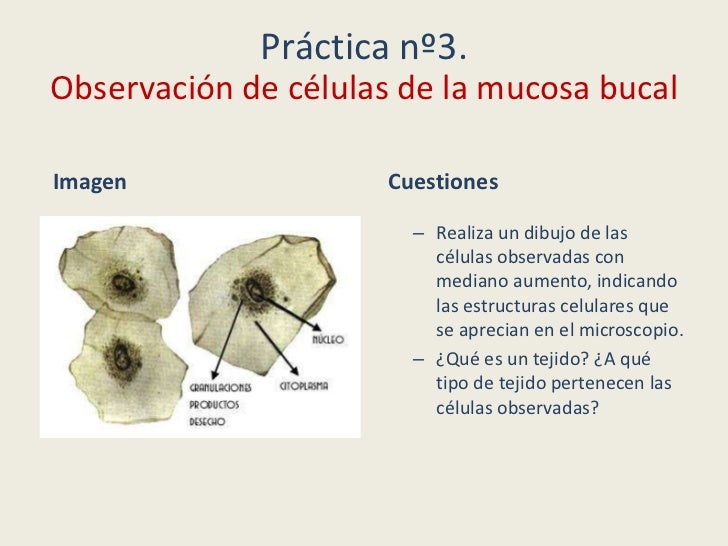 - 21. Práctica nº3.Observación de células de la mucosa bucalImagen Cuestiones – Realiza un dibujo de las células observadas con mediano aumento, indicando las estructuras celulares que se aprecian en el microscopio. – ¿Qué es un tejido? ¿A qué tipo de tejido pertenecen las células observadas?