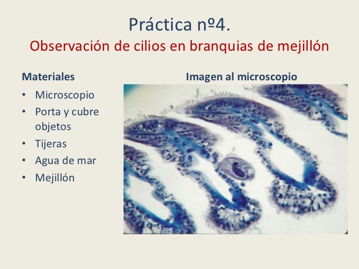 - 23. Práctica nº4. Observación de cilios en branquias de mejillón Objetivos:• El objetivo de la práctica es observar células animales vivas y el movimiento de los cilios que poseen. Los mejillones respiran por branquias, cuyos bordes contienen células ciliadas que aseguran la circulación del agua sobre la superficie de las branquias. La sangre (hemolinfa) del mejillón circula por las branquias, recoge el oxígeno disuelto en el agua del mar y libera el dióxido de carbono.• Las branquias de los bivalvos son órganos laminares y vascularizados que permiten a esta clase de moluscos intercambiar en el agua el O2 y el CO2. El intercambio gaseoso se ve favorecido por los cilios que recubren la superficie branquial y que además tienen la función de arrastrar las partículas en suspensión presentes en el agua hacia la cavidad bucal de estos animales.• Observar en vivo cómo las células de la superficie branquial generan corrientes mediante los cilios y favorecen así el intercambio de gases y la toma de partículas