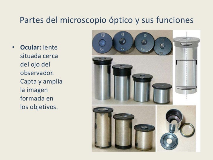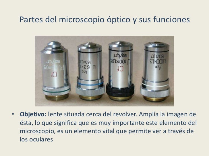- 4. Partes del microscopio óptico y sus funciones• Objetivo: lente situada cerca del revolver. Amplía la imagen de ésta, lo que significa que es muy importante este elemento del microscopio, es un elemento vital que permite ver a través de los oculares