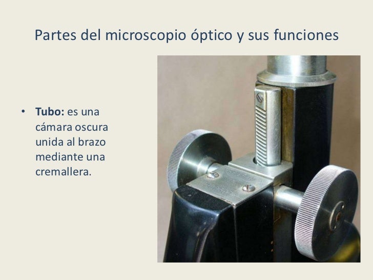 - 6. Partes del microscopio óptico y sus funciones• Tubo: es una cámara oscura unida al brazo mediante una cremallera.