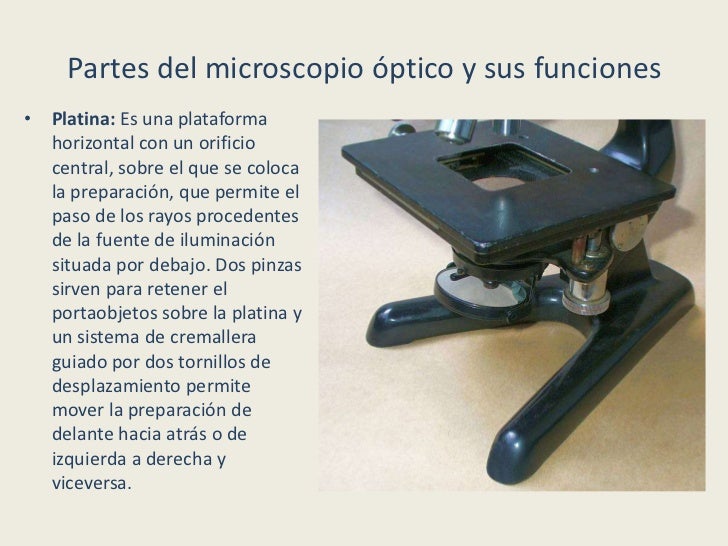 - 8. Partes del microscopio óptico y sus funciones• Platina: Es una plataforma horizontal con un orificio central, sobre el que se coloca la preparación, que permite el paso de los rayos procedentes de la fuente de iluminación situada por debajo. Dos pinzas sirven para retener el portaobjetos sobre la platina y un sistema de cremallera guiado por dos tornillos de desplazamiento permite mover la preparación de delante hacia atrás o de izquierda a derecha y viceversa.